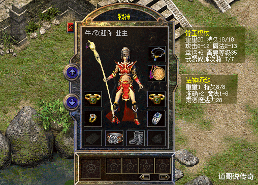 再看看武器方面,骨玉权杖是魔13的属性,虽说没有跳点也已经很强悍了。只可惜啊,这把骨玉权杖的幸运值没喝上去,唯一放心的是不怕破碎,只是马内的问题。搭配的一根普通法神项链,输出上限还是可以的。对于护身巨法而言,这应该就是平时拿着的搭配,团战了肯定有高魔运九套。